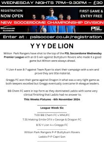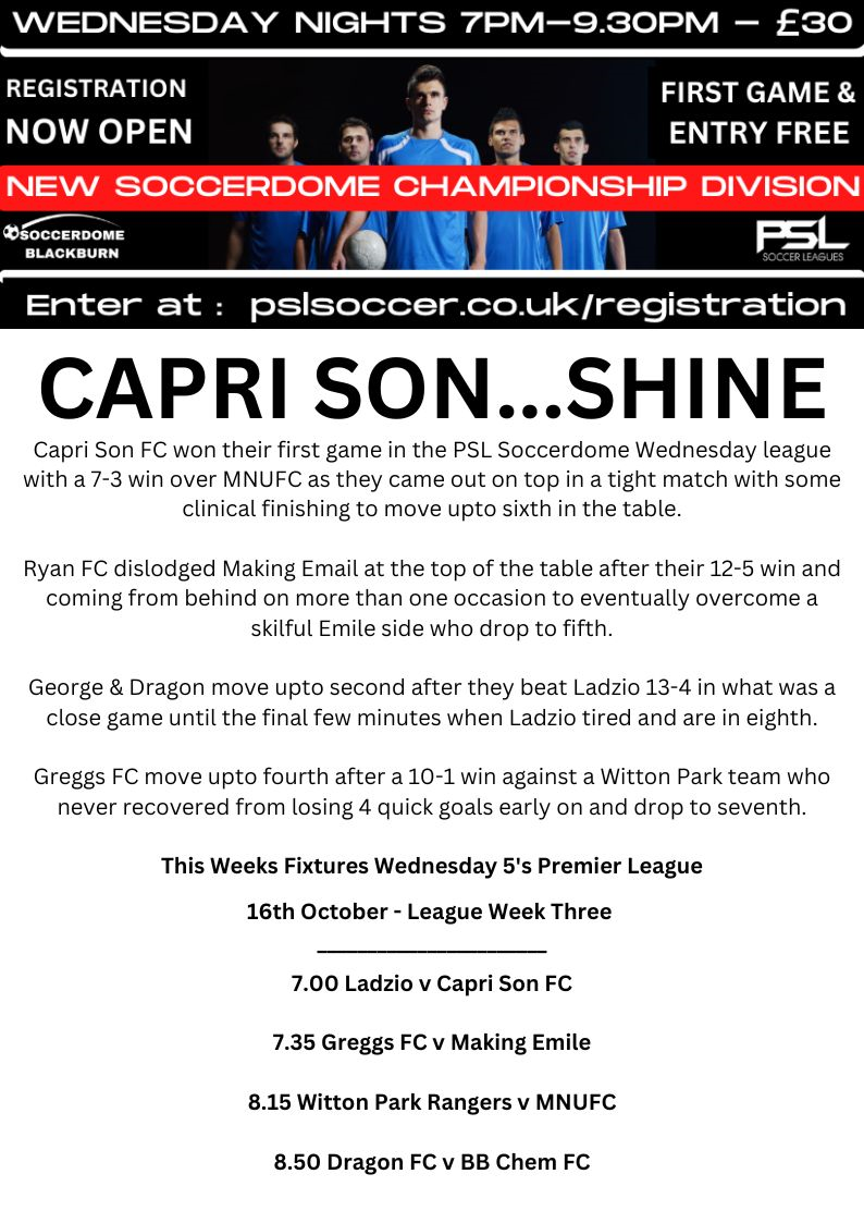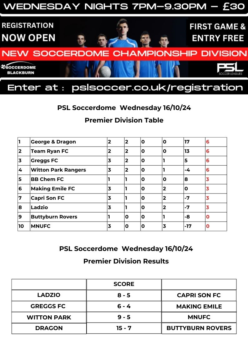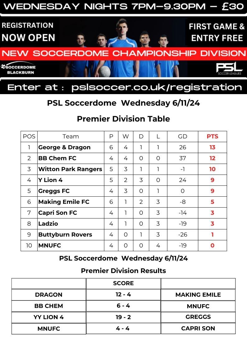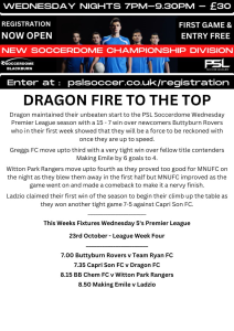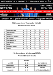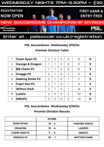 PSL Soccerdome Wednesday 5’s Premier League Results